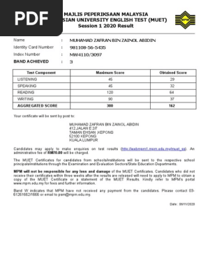 View Homework Help - MUETpdf from AA 1 MALAYSIAN UNIVERSITY ENGLISH TEST MUET REGISTRATION SLIP FOR SESSION 1 2020 NAME. 23-07-2022 0510 PM - 0530 PM BD. 800729-08-5298 or A2152856 or.